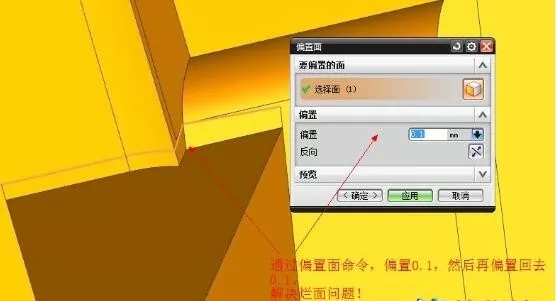 2.先把烂面位置偏置0.1出来,倒圆角,最后再偏置回去。