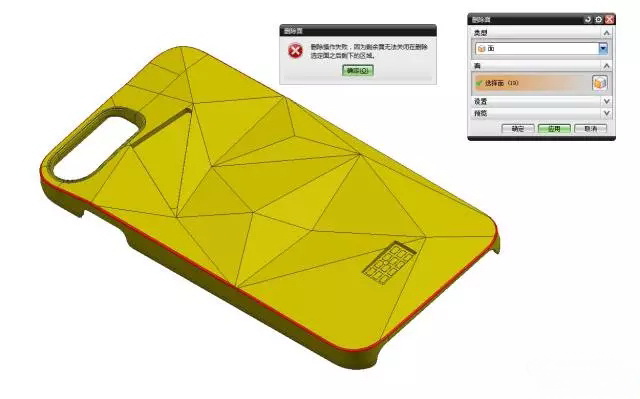 1.我们先尝试一下用同步建模里面的“删除面”命令,选完红色的R角——确定,结果出现报警,存在复合面的R角用“删除面” 很难去除