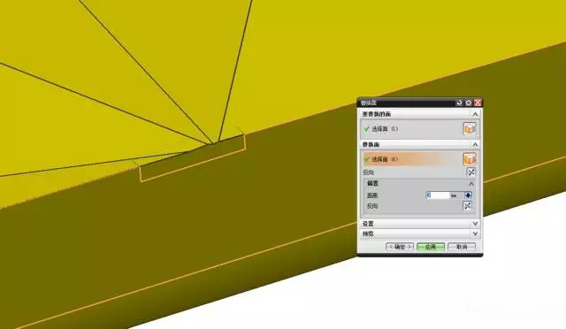 5.去除完R角之后,再利用同步建模里的“替换面”命令将求差掉的部分替换回来,如下图所示,拔完模以后再将R角倒回来即可。