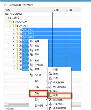 9、选择上所有程式,右键-刀轨-仿真准备开始机床仿真,如下图: