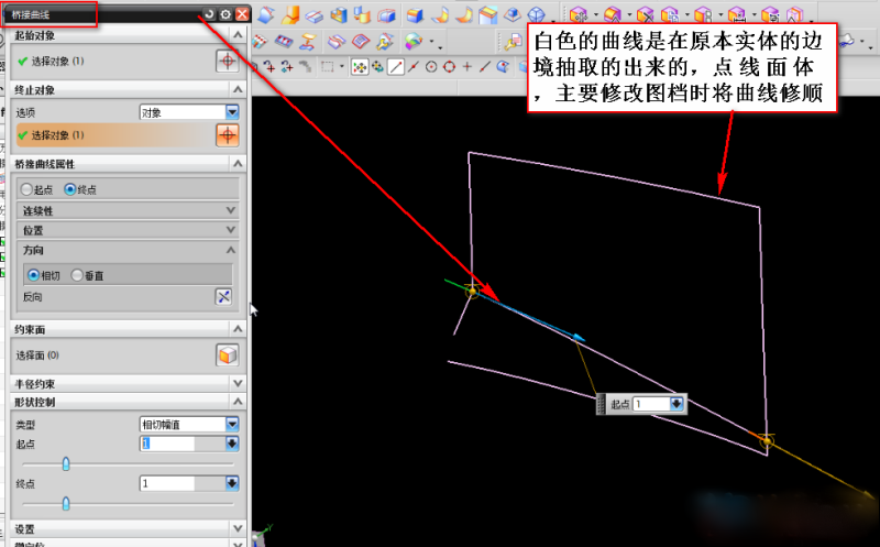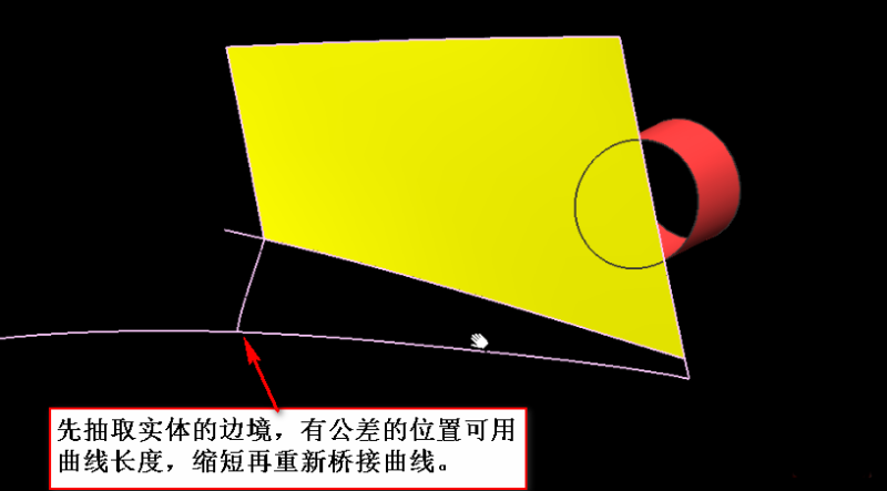 六、先抽取原本实体的边境作为基准参照线,有公差的曲线距离比较短的情况下用曲线长度缩短后,重新桥接曲线。
