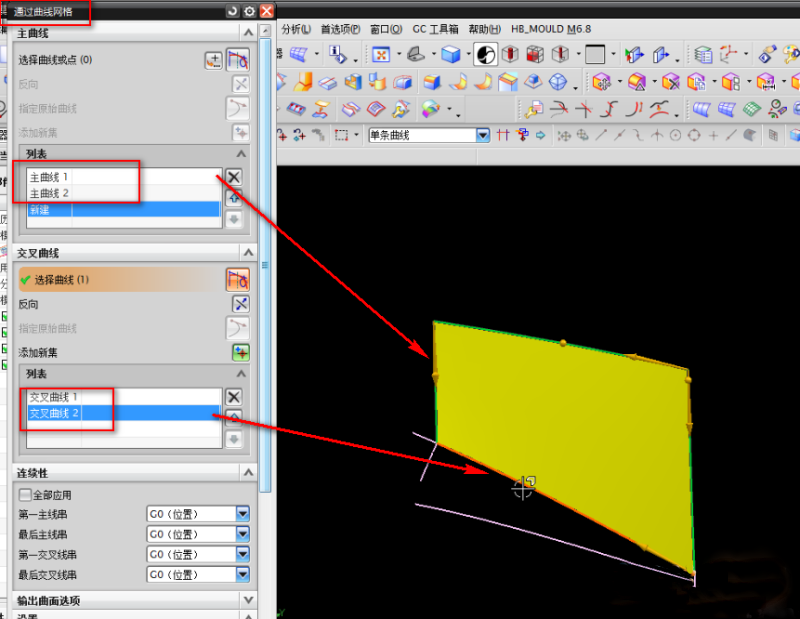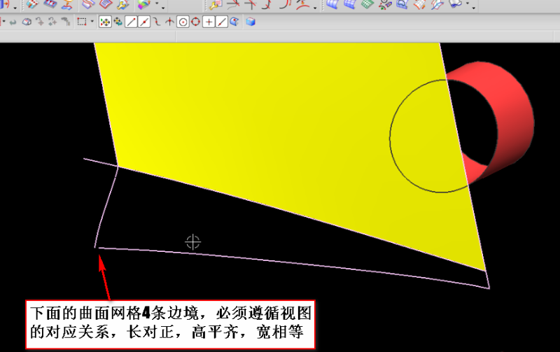 四、构建通过曲线网格时要注意两个问题,主线串和交叉线串的拐角角度是否接近90度,主线串和交叉线串是否符合视图的对应关系,长对正,高平齐,宽相等。