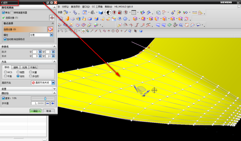 九、有两种方法第一;可添加多条截面线来控制曲面的变化,第二;用编辑菜单——曲面——X成型控制调整U V方向的点 不能有高低不平的点。