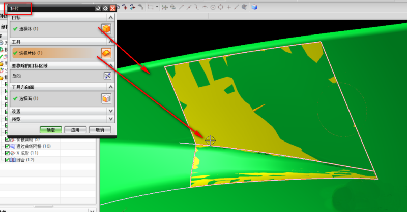 十、关键最后一步两个曲面构建完毕一定先缝合,其二要检查片体的边境要保证在实体的面上,不能够有公差大干0.0254,最后再通过补片的强大功能来修复烂面。