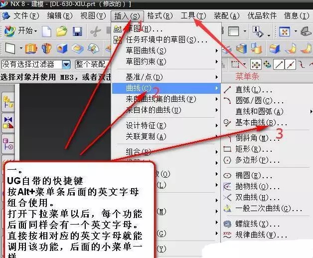 我们打开UG以后,会发现菜单条后面还有其他的下拉菜单功能后面,都会有些英文字母,这些英文字母就是UG自带的快捷键了。