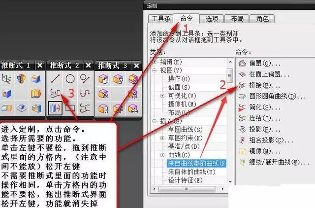 进入定制中的命令里面,可以把想要的功能拖到想要的位置上面。同时按Shift+Ctrl+鼠标键。就能调用出相对的推断式