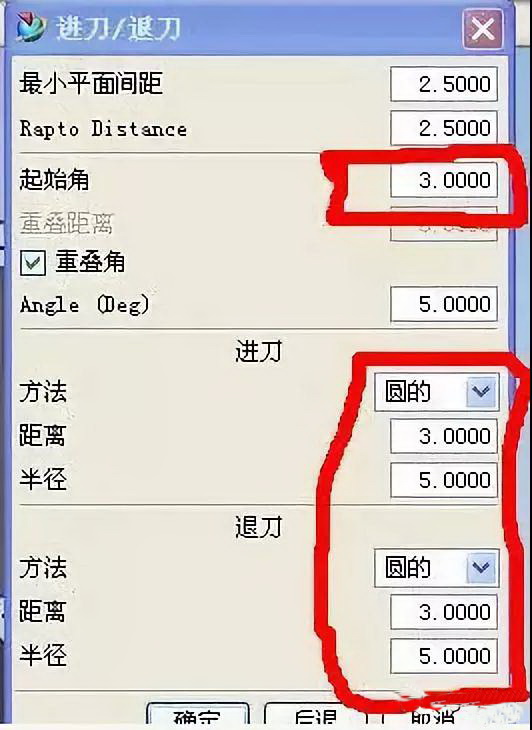 最好是以圆弧进退刀,对刀具冲击力度小。设置的半径的必须大于距离。