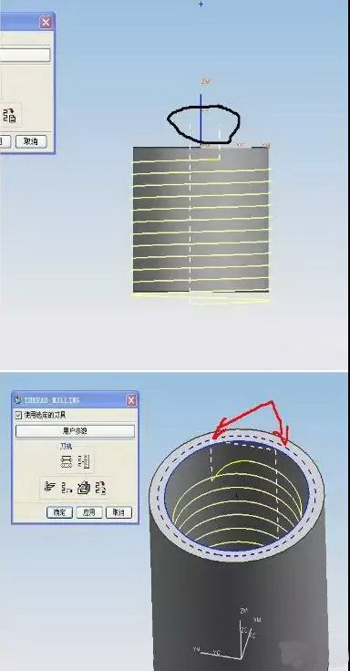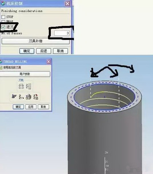 由于螺纹不能一刀到位,XY要分层铣所以勾上退刀选项是指走完一刀,沿圆弧退回到起始点再走。