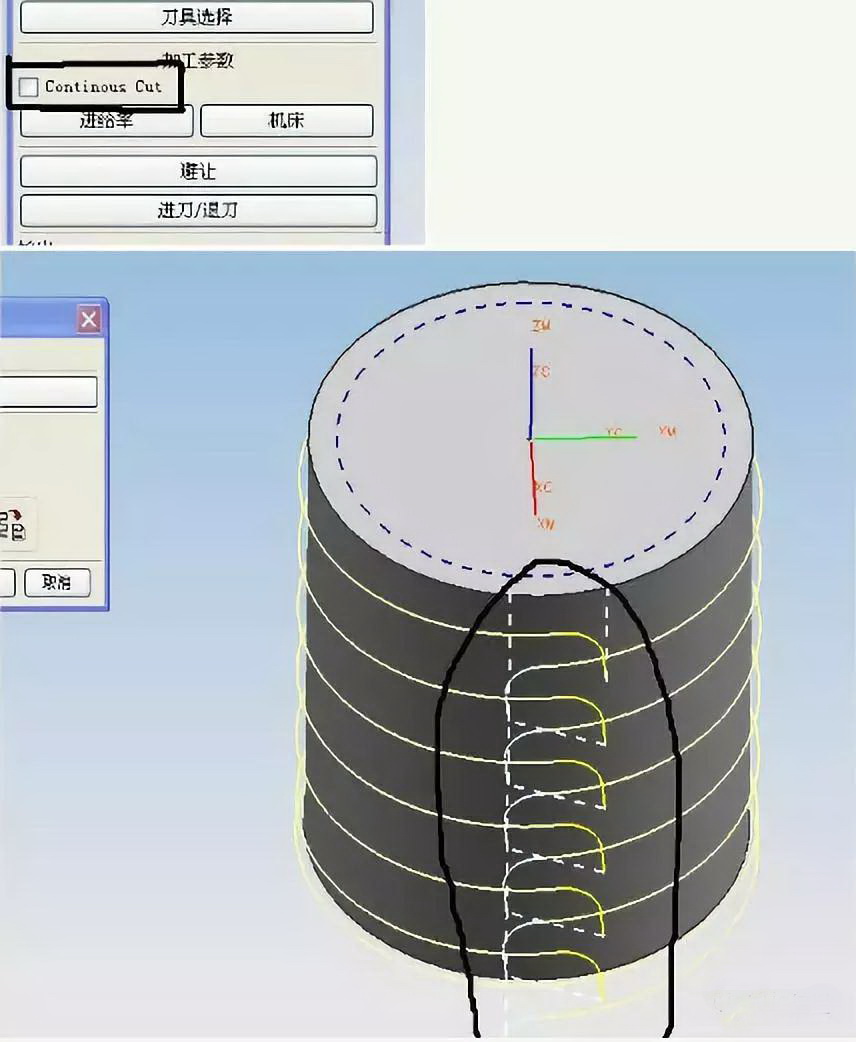 12.Continous Cut 勾上连续下刀不勾则走一刀回转下降抬刀。