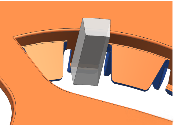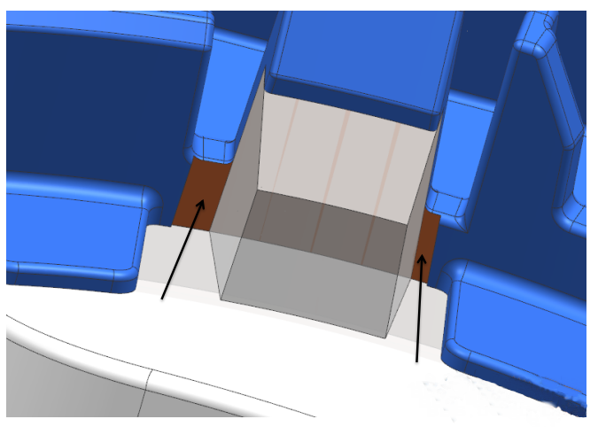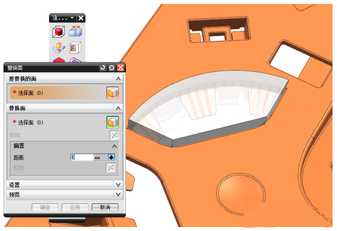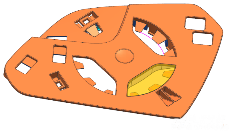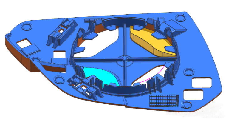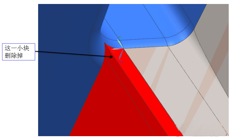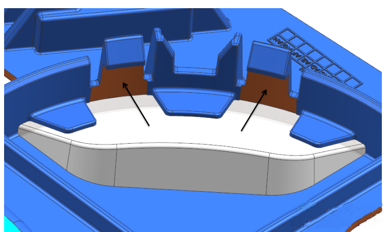 我们先来填补这个地方的孔吧,黄色面出前模,蓝色面出后模