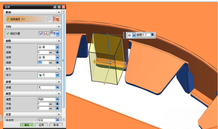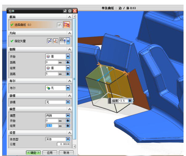 这块黄色实体分割成3块,坐标调好方向,拉伸2个辅助面,实体分别替换上去