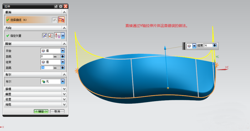 步骤1 ;如果直接用轮廓线拉伸片体这种方法是不合理的问题有二,其一;片体明显两端有尖锐角,其二,从另外视图观察会导致产品厚度不均匀问题。,