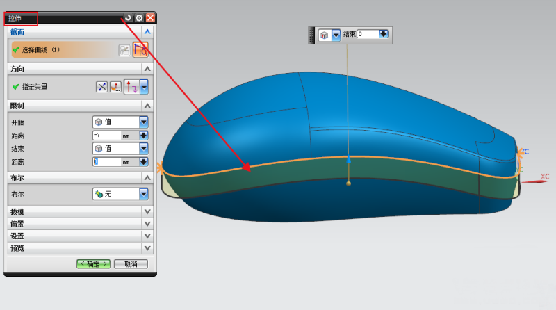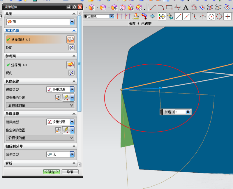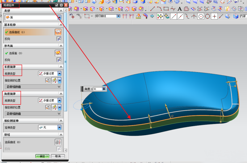 步骤3;利用规律延伸功能;可控制参考面的长度和角度,关键是沿着外观面法向角度为90度。, q/ Y# S2 O+ h L! H