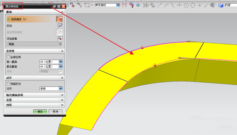 步骤5;如果构建中遇到片体在圆角处高底落差不顺畅,考虑重新桥接曲线顺畅后再用通过曲线组。# r