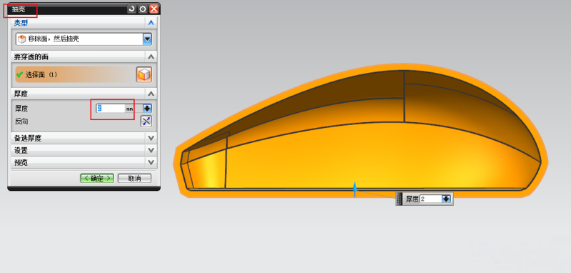 步骤6;鼠标的外观面确定没问题以及转变实体后用抽壳功能,产品厚度为2mm。