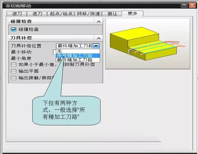 2、在非切削移动-更多-刀具半径补偿,刀具补偿位置下拉如下图: