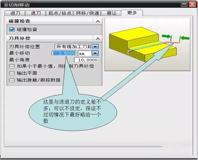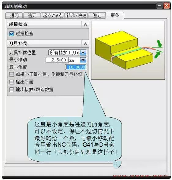 3、选择了所有精加工刀路后,在下面会多两个“最小移动”与“最小角度”参数,设置如下: