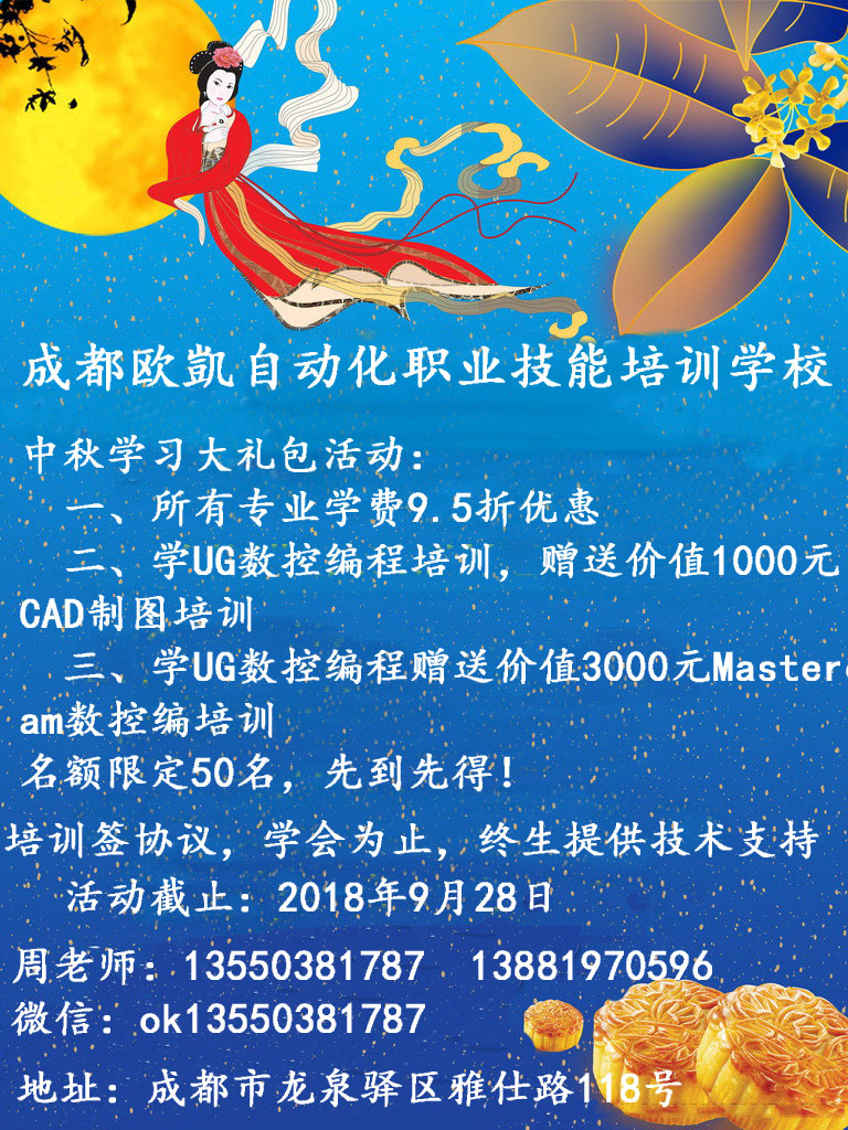 成都欧凱培训中心,专注于UG技术服务,用心打造全国最大最专业的UG模具实战培训机构,常年开设UG产品设计、UG数控编程、UG五轴编程。实行“理论+实习+实训”一条龙服务,不只是软件命令和操作的学习,更注重思路、方法、经验、技巧的训练,抛弃“照本宣科”的教学模式,自始至终围绕着“工厂实际经验”来教学!
