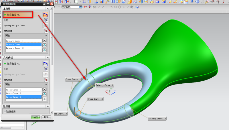 步骤6;通过曲面曲线网格可以封闭的曲线,但是要注意箭头的方向一但不对可能就变形比较大,建议分断曲线。