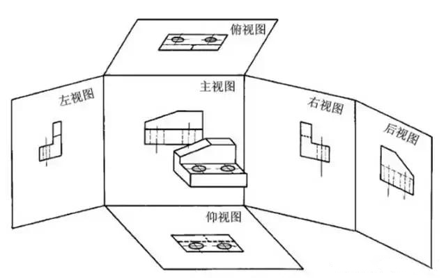 第三角视图画法:投影面位于观察者与物体之间,这样各视图的配置关系是:主视图在中,左视图在左,右视图在右,俯视图在上,仰视图在下,后视图可配置在最右也可以配置在最左,如下图: